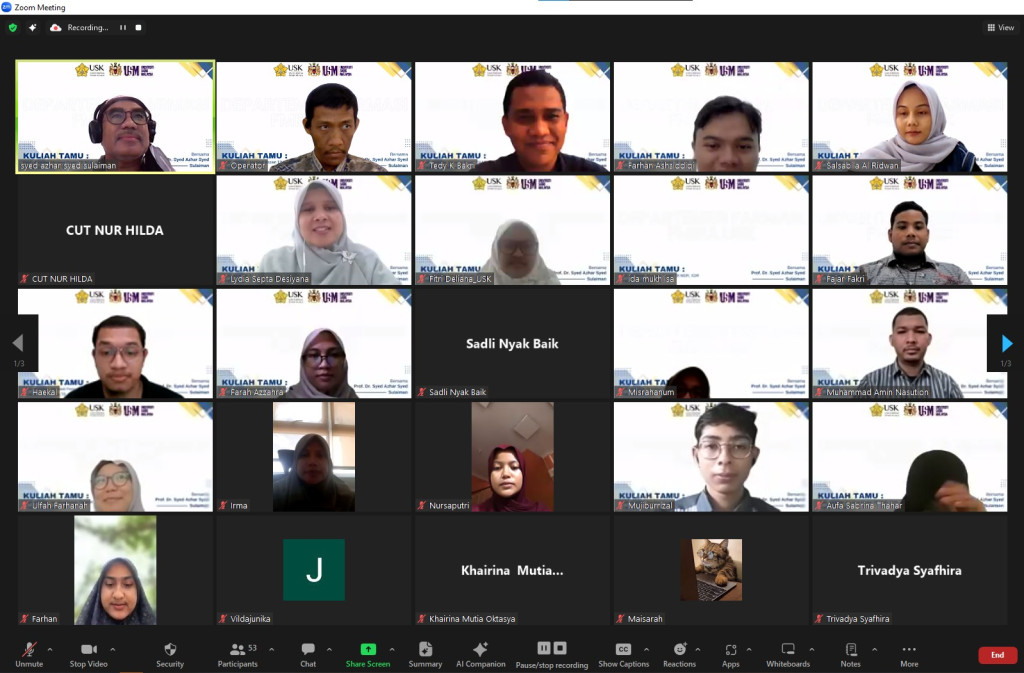 Banda Aceh, May 22, 2024 – The Department of Pharmacy, FMIPA USK, held a guest lecture via Zoom on The Role of Pharmacists in Managing MDR TB, XDR TB, and Case Discussions on TB. Prof. Dr. Syed Azhar Syed Sulaiman from the Universiti Sains Malaysia was the keynote speaker. The guest lecture, held from 09.00 to 12.30 WIB, was attended by lecturers, students, and healthcare professionals.