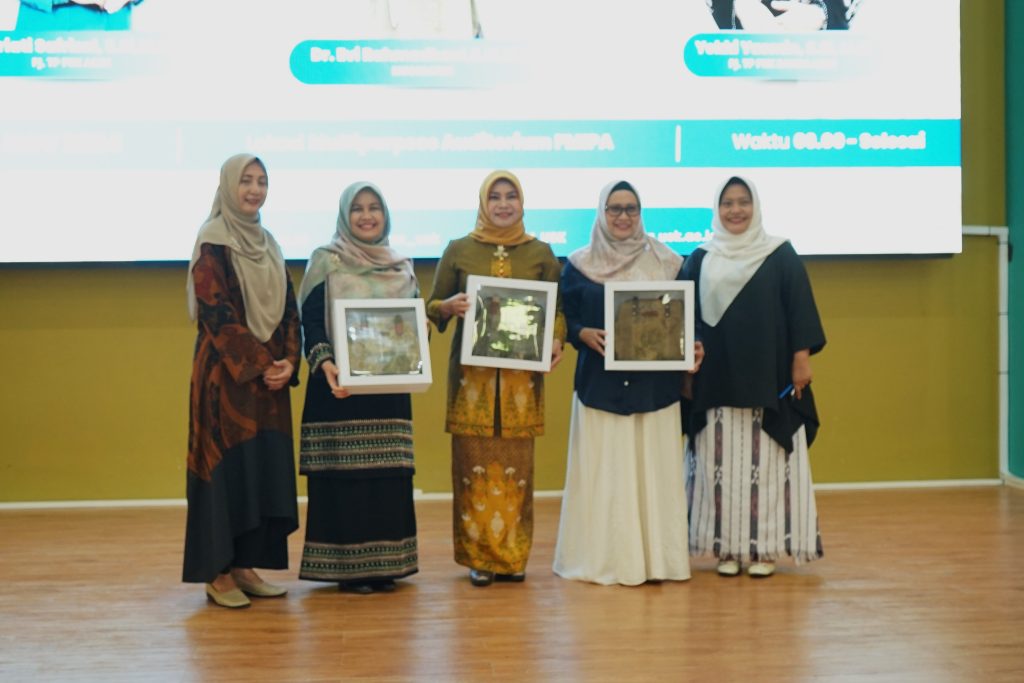 In appreciation of the speakers’ contributions, FMIPA-USK, through the Head of Dharma Wanita, Ibu Ridha Ferdhiana, S.Si., M.Sc., presented a special gift: eco-print products crafted by Biology Department students. These eco-friendly items reflect the integration of creativity with environmental awareness, a value emphasized in FMIPA-USK’s educational approach.